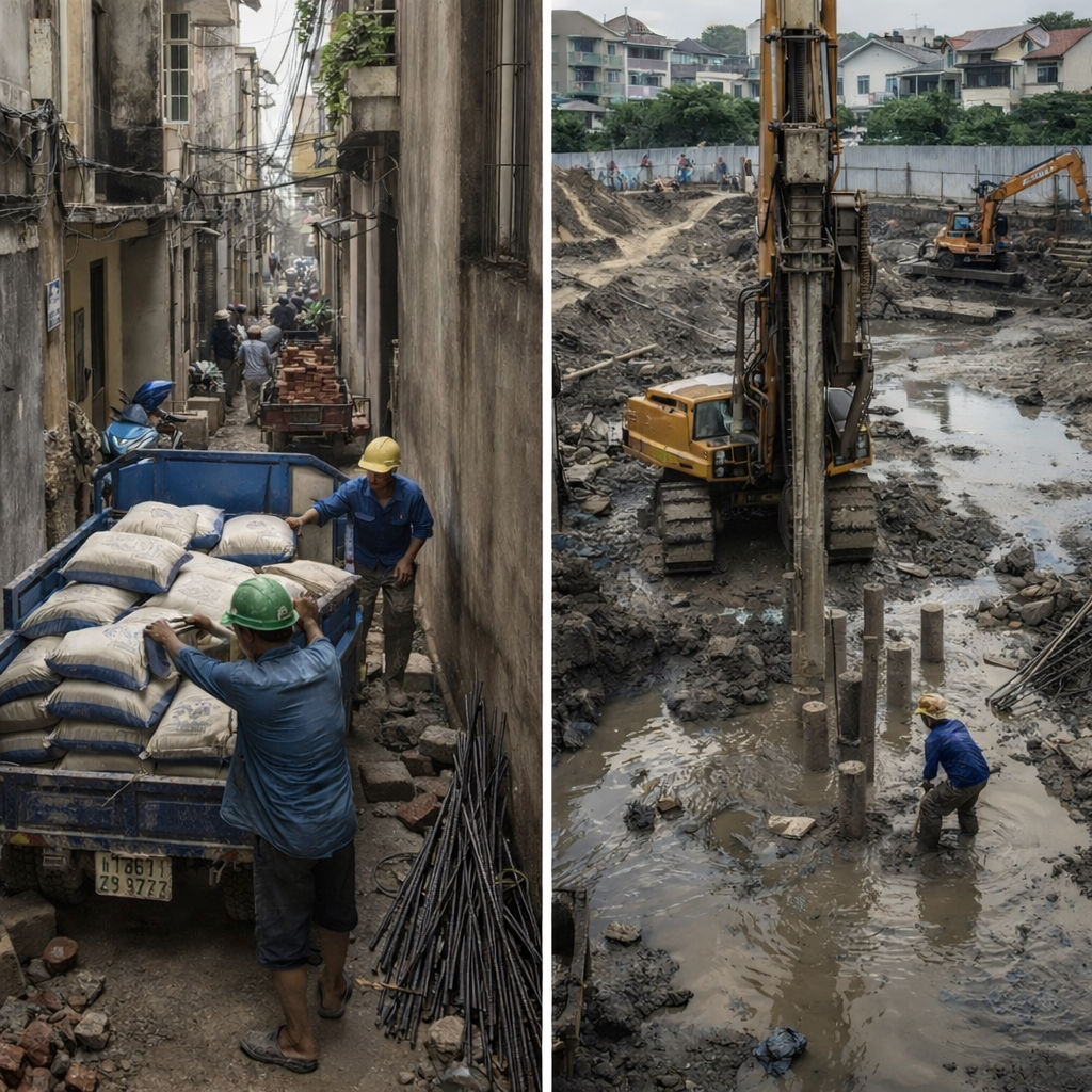 Nhà nằm trong ngõ nhỏ, đường xe tải khó vào hoặc xa khu dân cư thường có chi phí vận chuyển vật tư cao hơn.