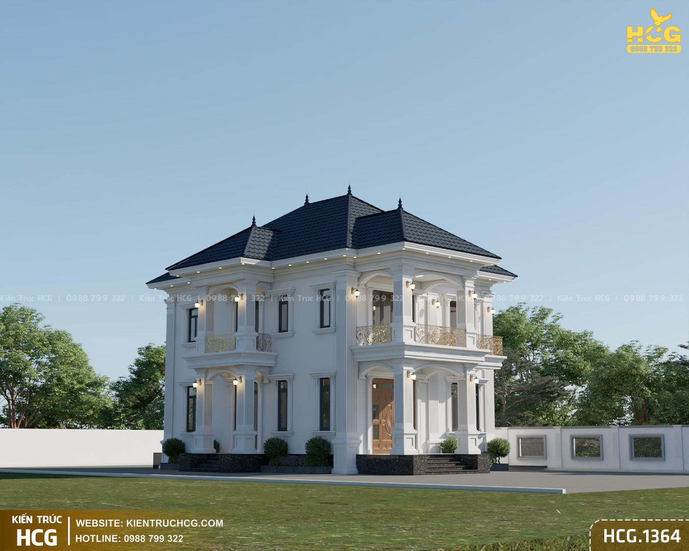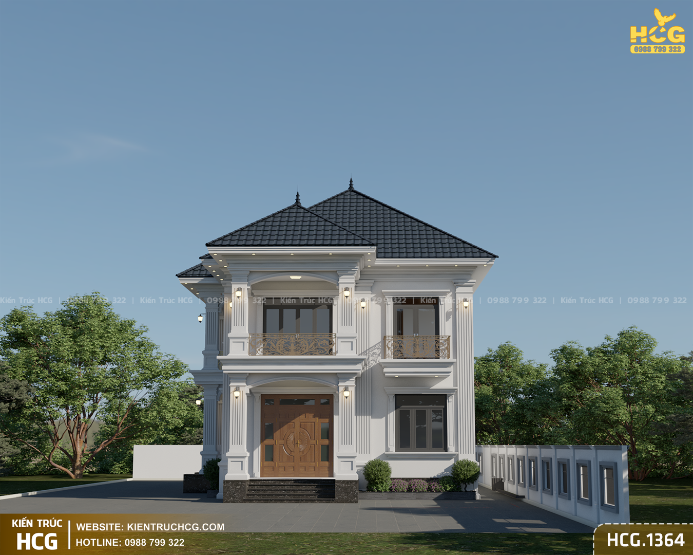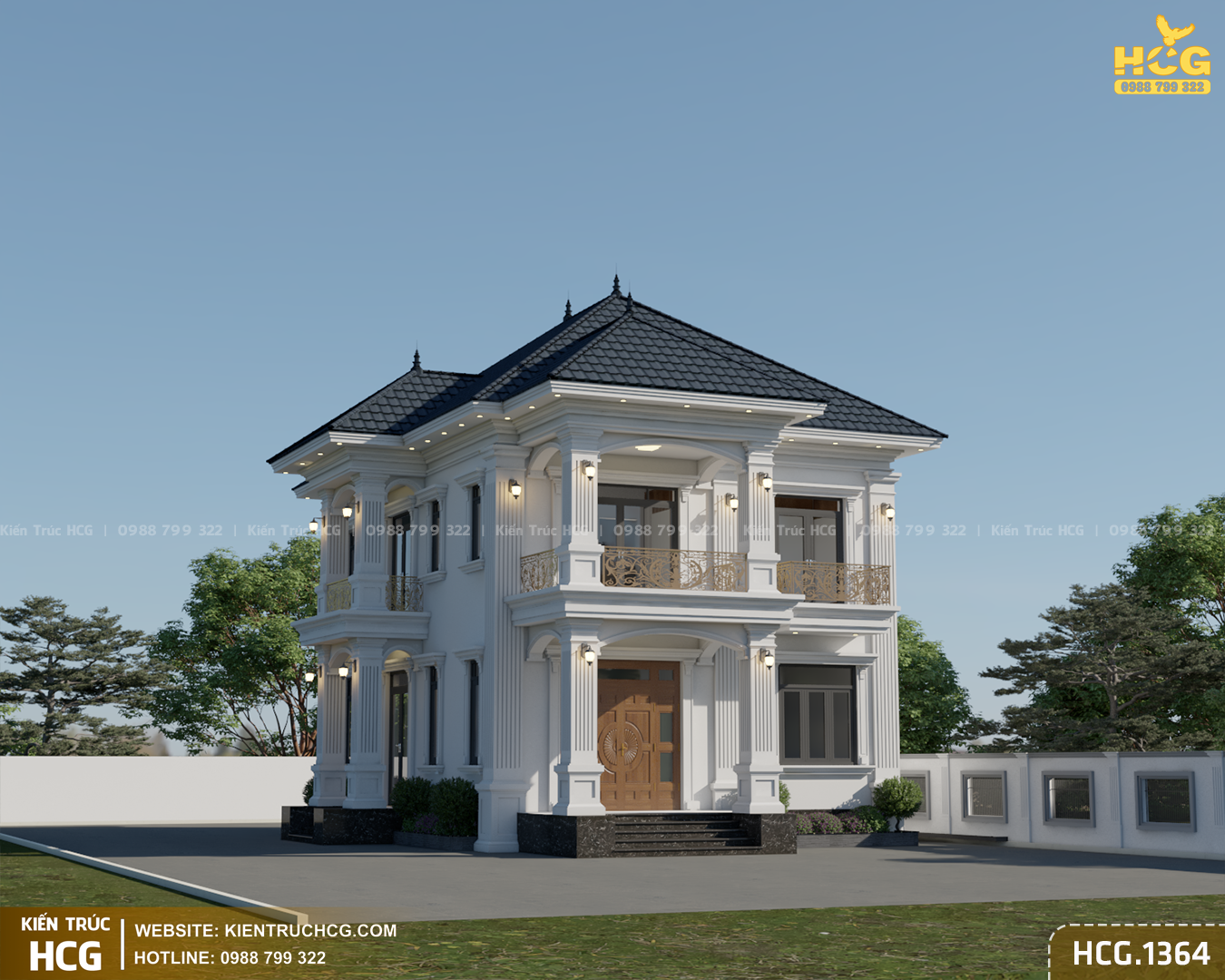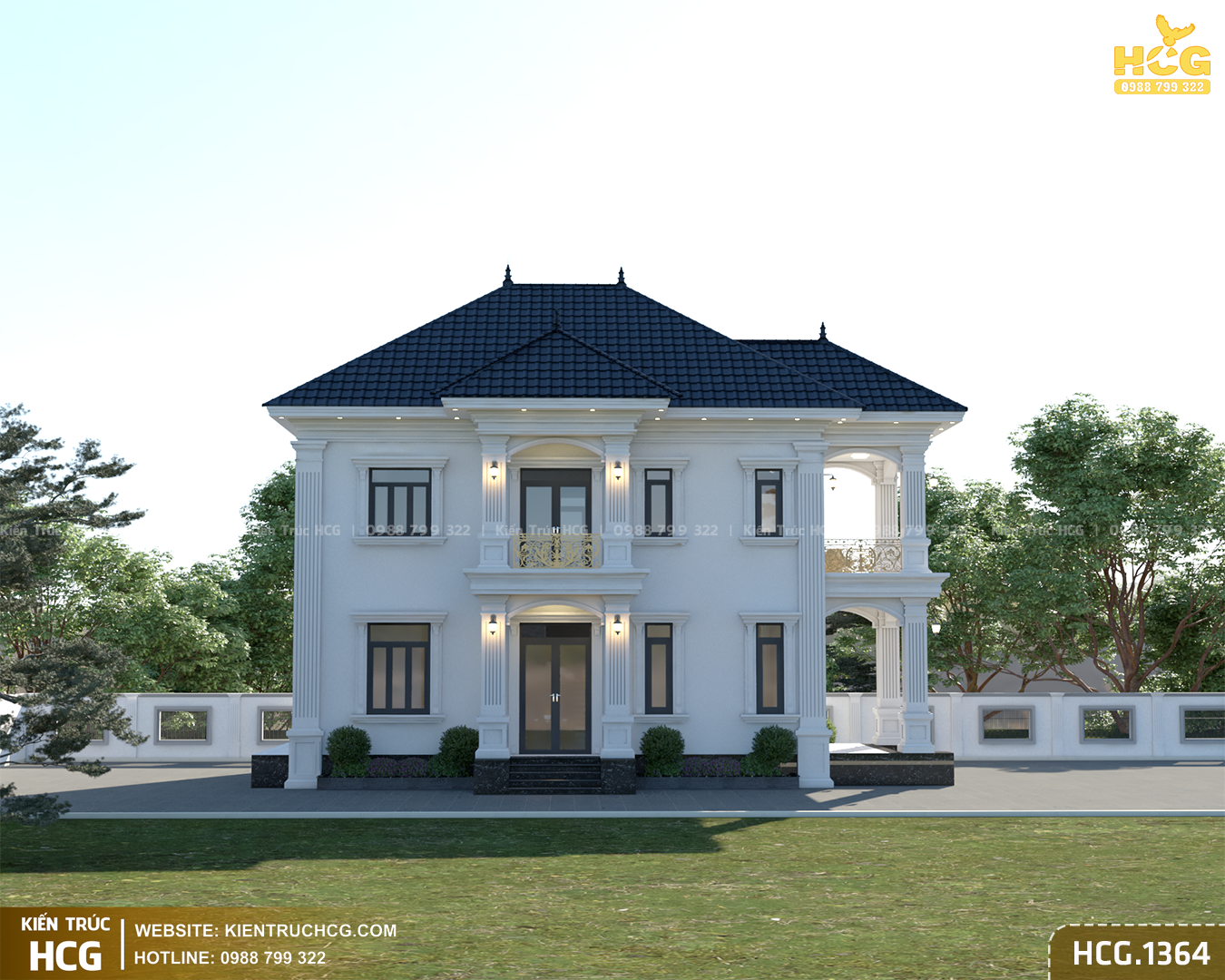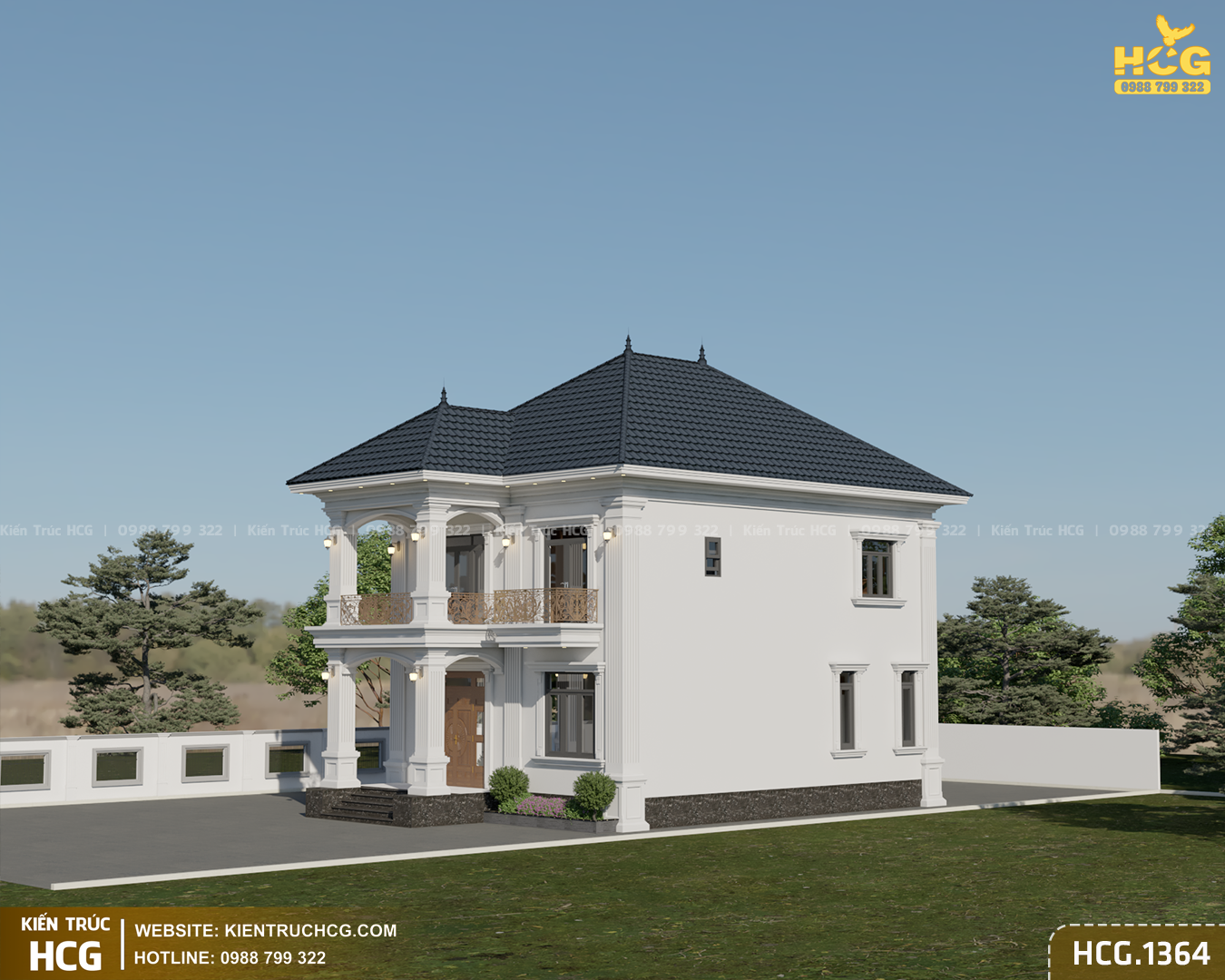 HCG.1364 là mẫu biệt thự 2 tầng mái nhật phong cách tân cổ điển do Kiến Trúc HCG thiết kế cho khu đất mặt tiền 9m – kích thước phổ biến tại đô thị và khu dân cư ven đô. Công trình hướng tới sự bề thế vừa phải, tinh tế trong chi tiết và tối ưu công năng, phù hợp nhu cầu ở lâu dài của gia đình hiện đại.