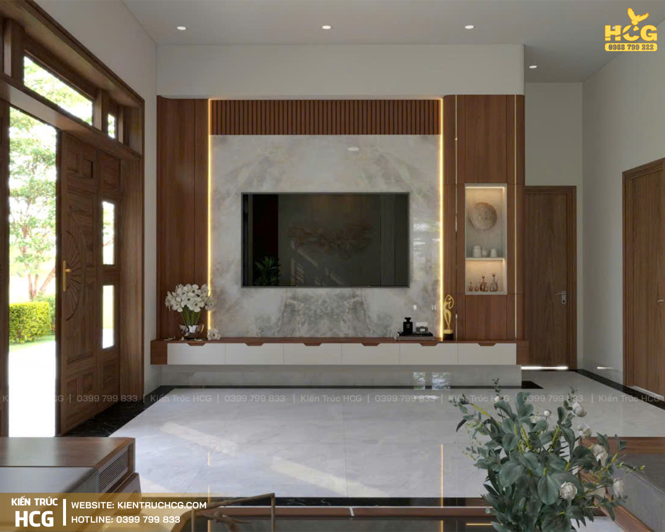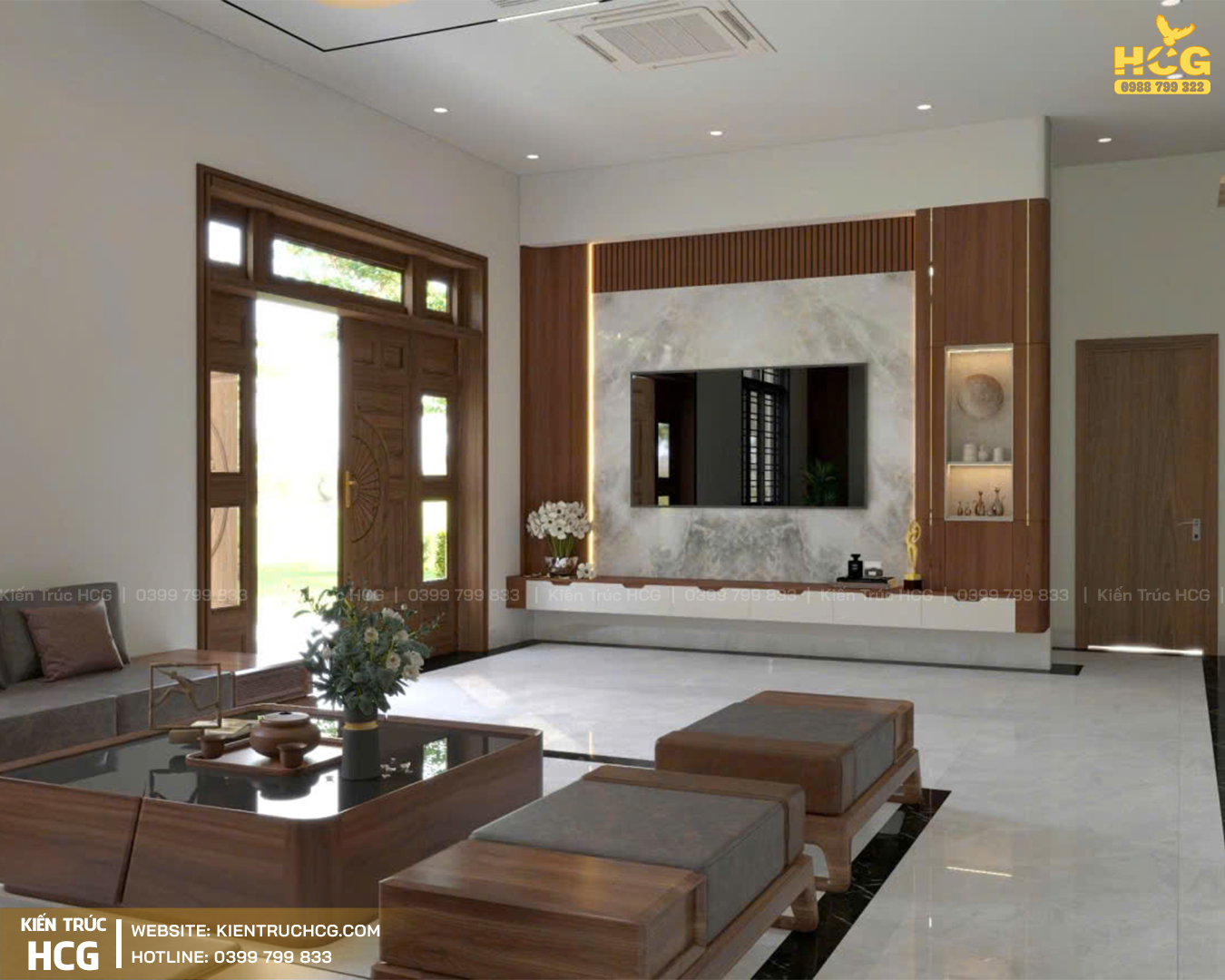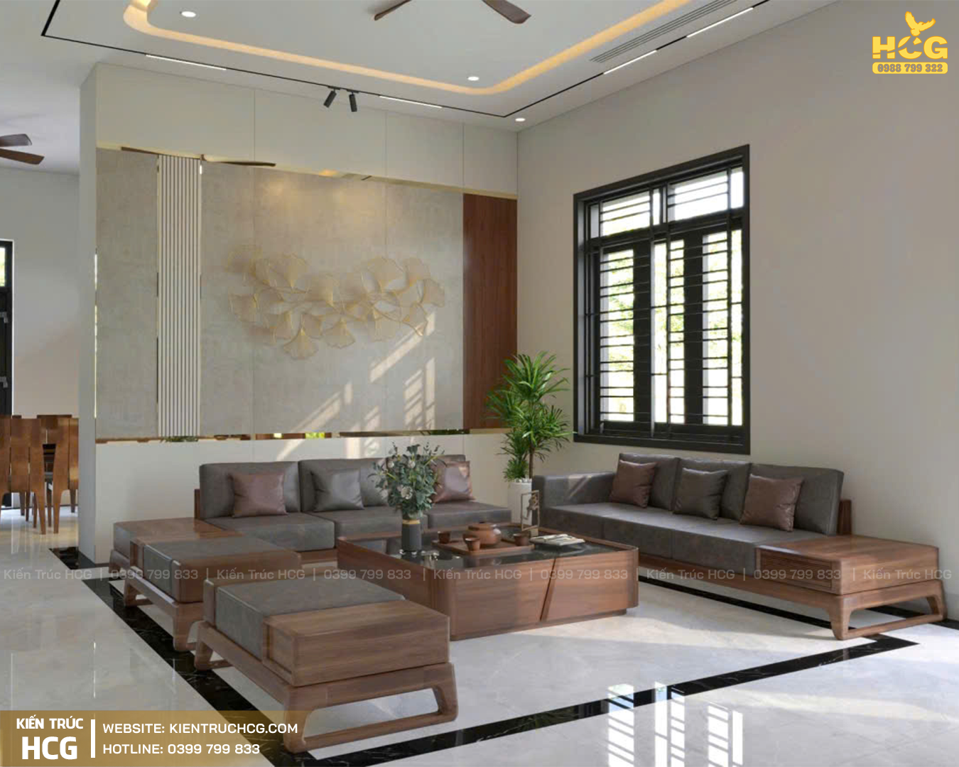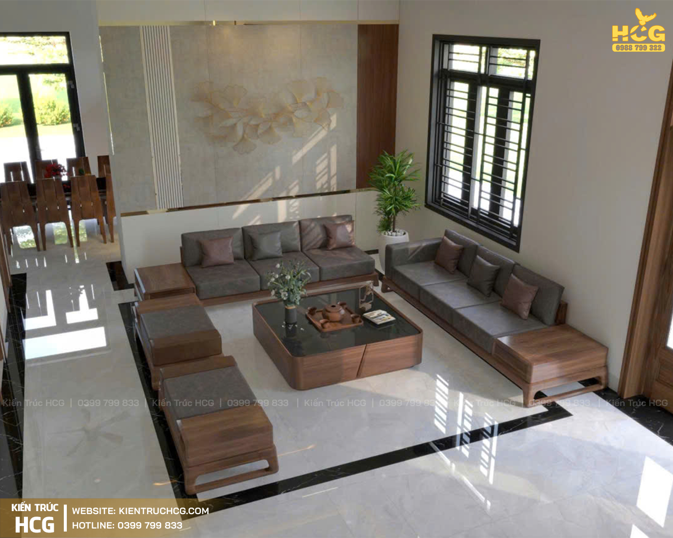 Phòng khách: Sang trọng, bề thế với điểm nhấn nội thất gỗ hiện đại, thể hiện đẳng cấp khi đón khách.