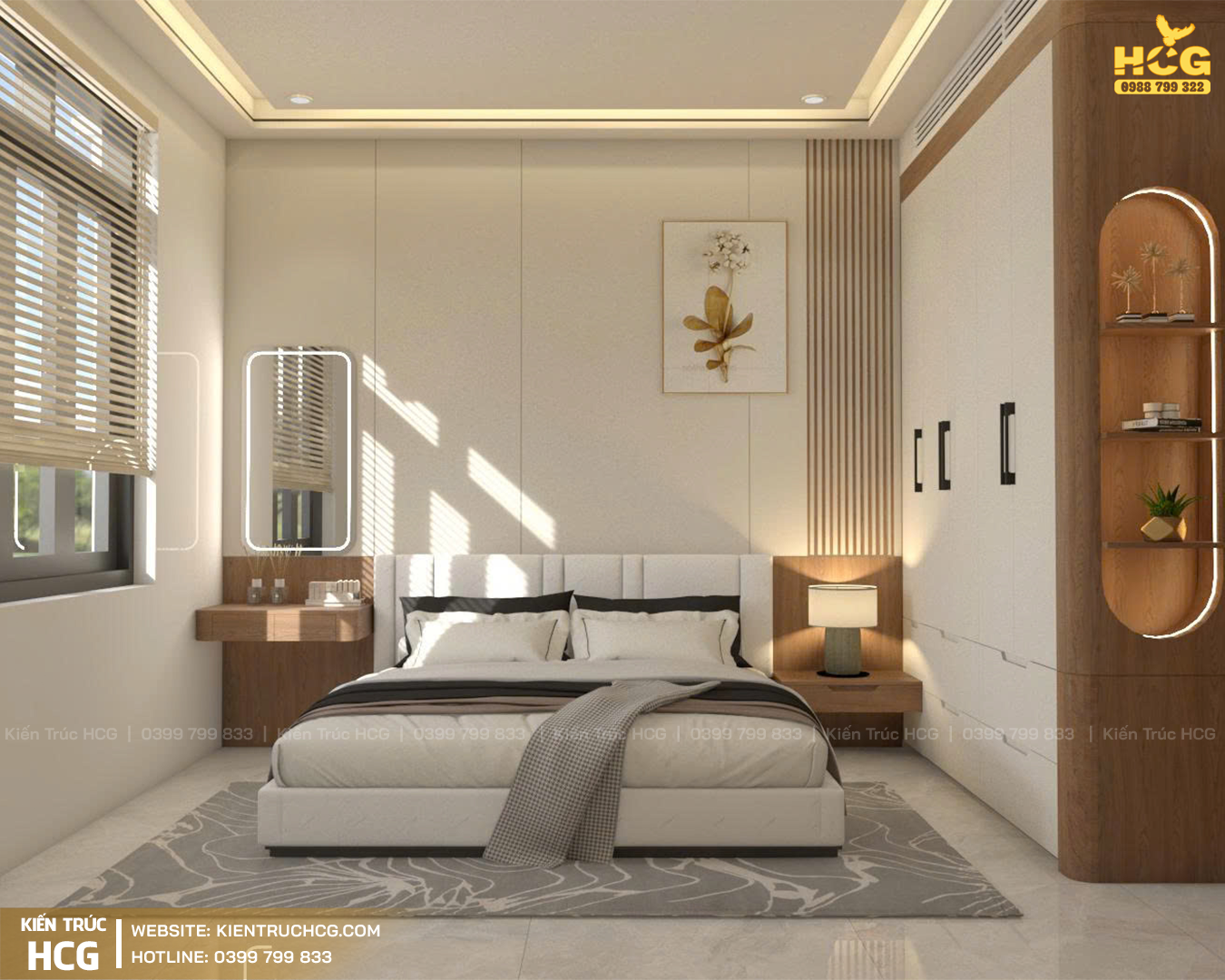 Tại phòng ngủ: Tiết chế tối đa chi tiết thừa. Sử dụng nội thất tinh gọn (giường bọc nệm, bàn phấn treo tường) kết hợp cùng rèm sáo gỗ điều chỉnh ánh sáng linh hoạt, biến căn phòng thành một không gian "chữa lành" thư thái và tĩnh lặng.