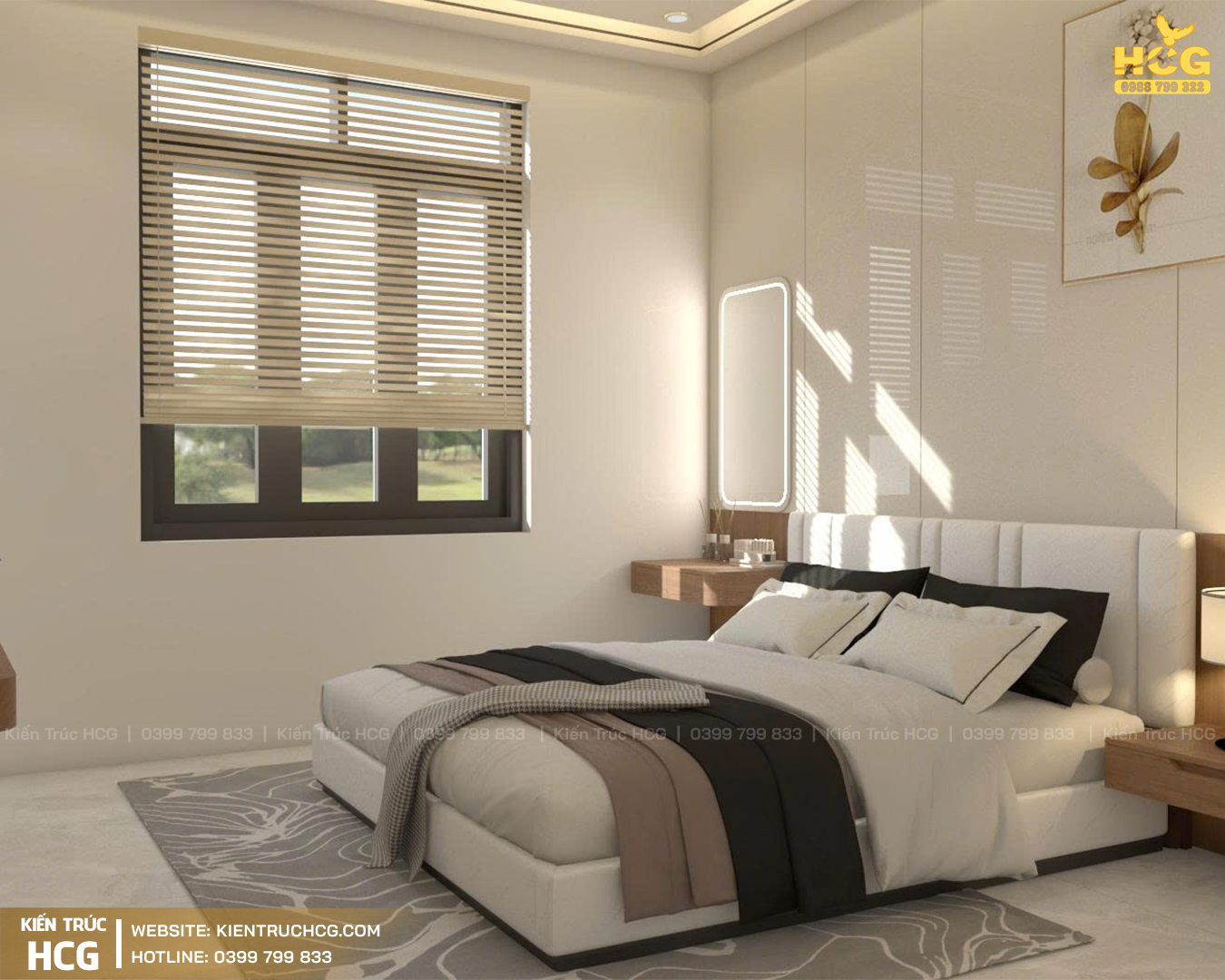 Thiết kế tối giản, tinh tế: Giường ngủ bọc nệm êm ái với thiết kế hiện đại, kết hợp cùng tab trang điểm treo tường tối giản và gương LED bo góc mang đến một tổng thể liền mạch, gọn gàng và không kém phần lãng mạn.