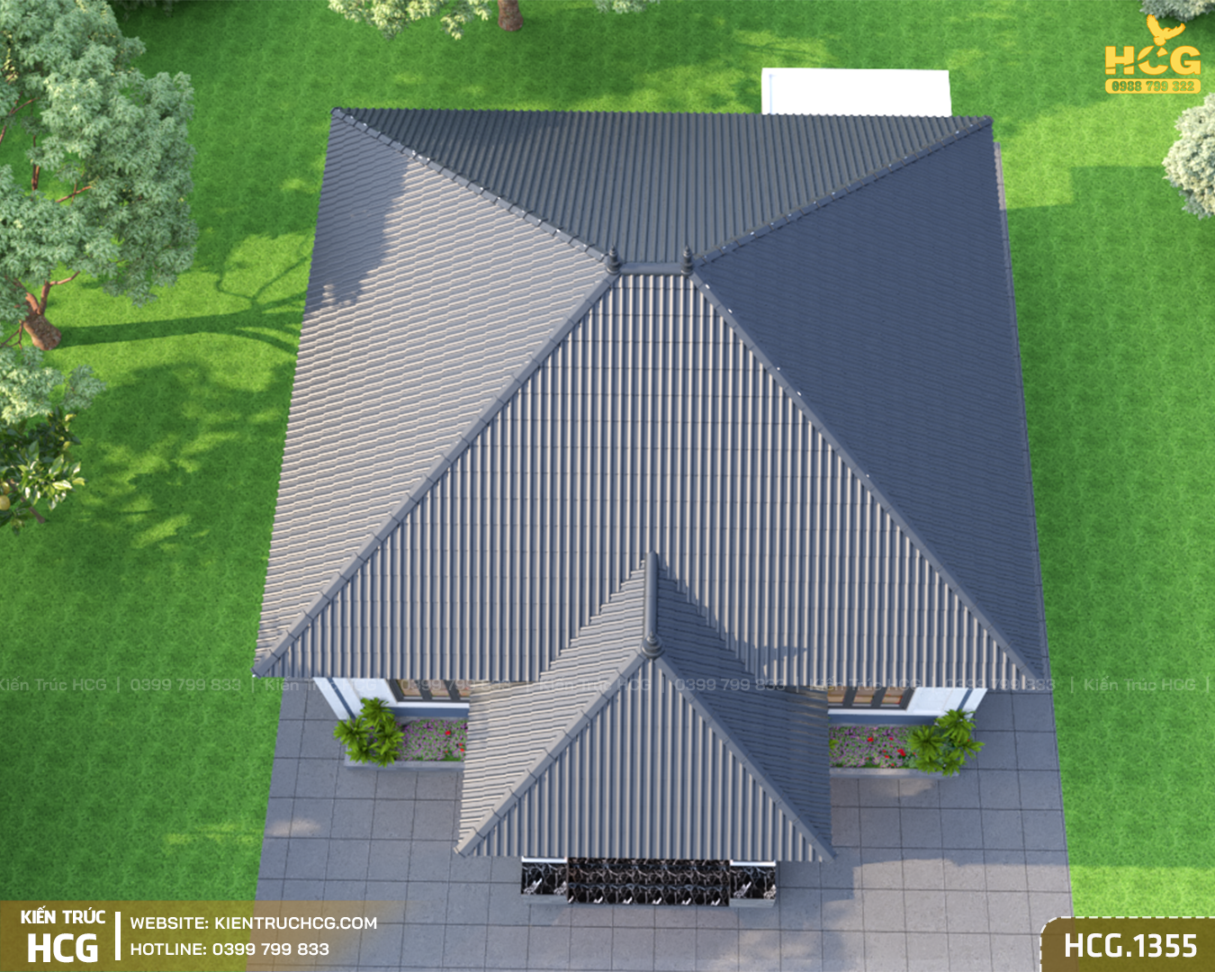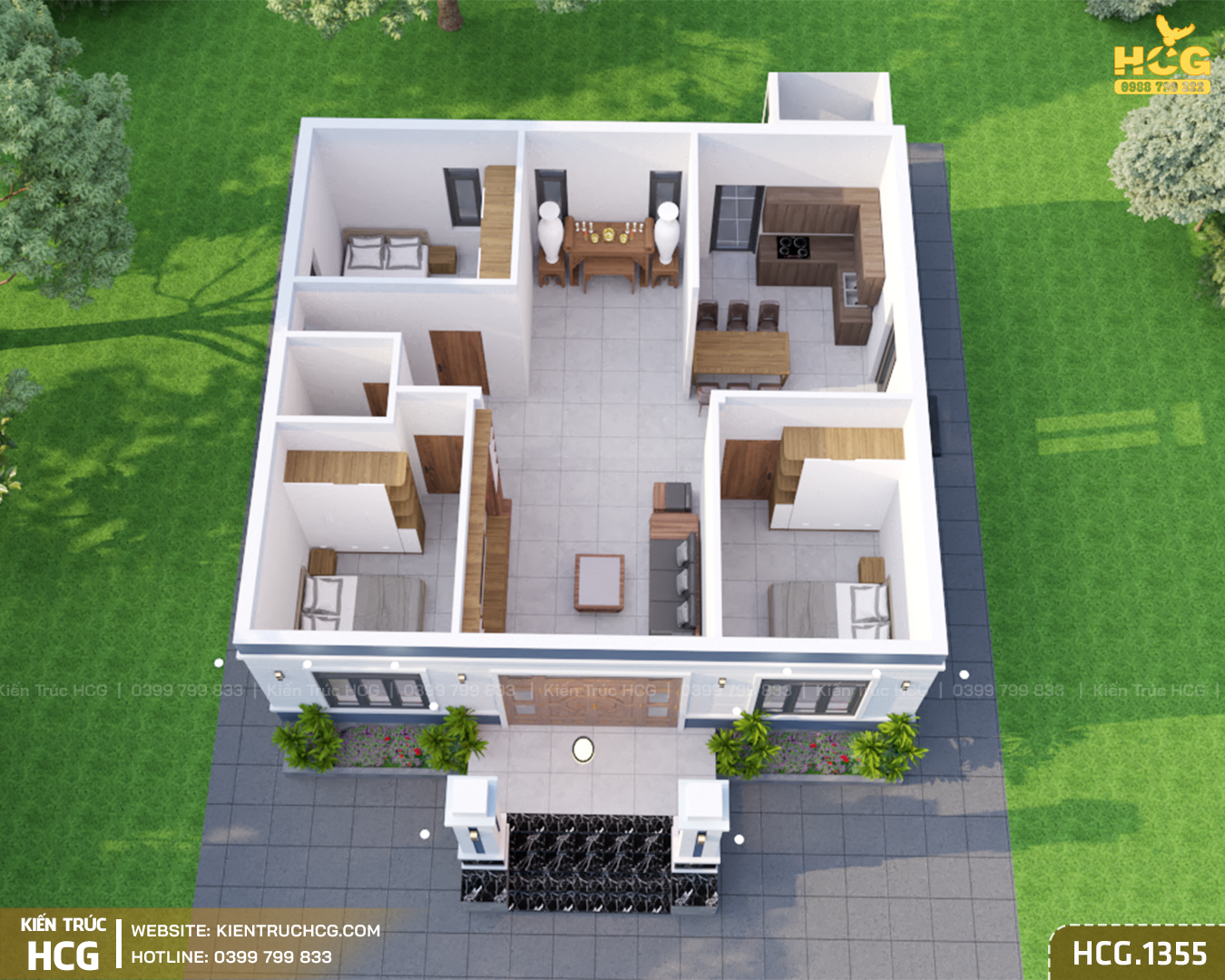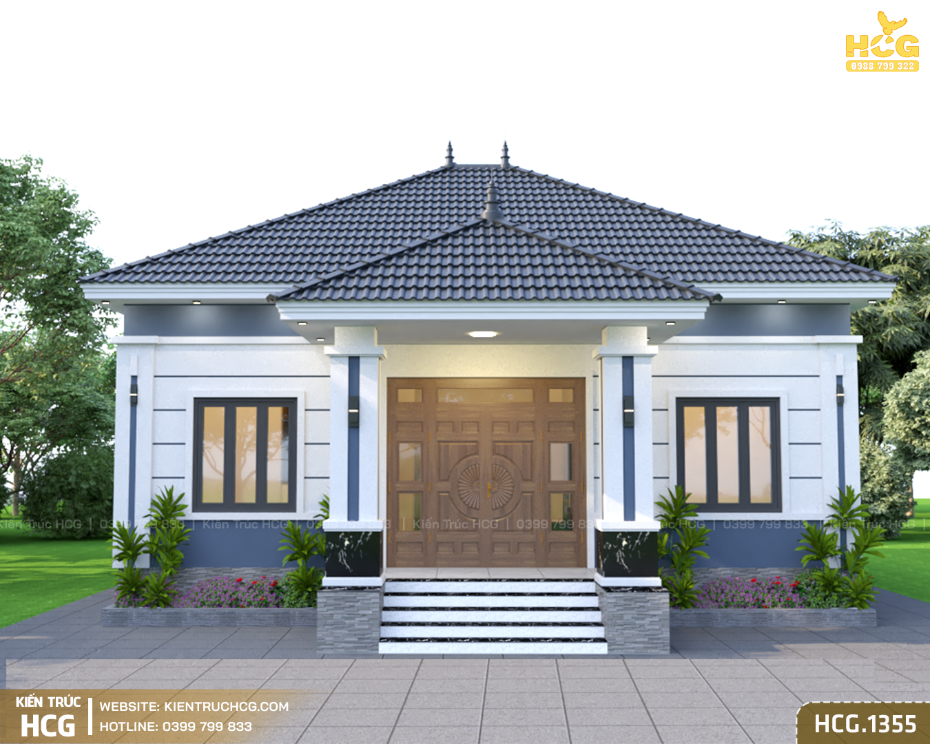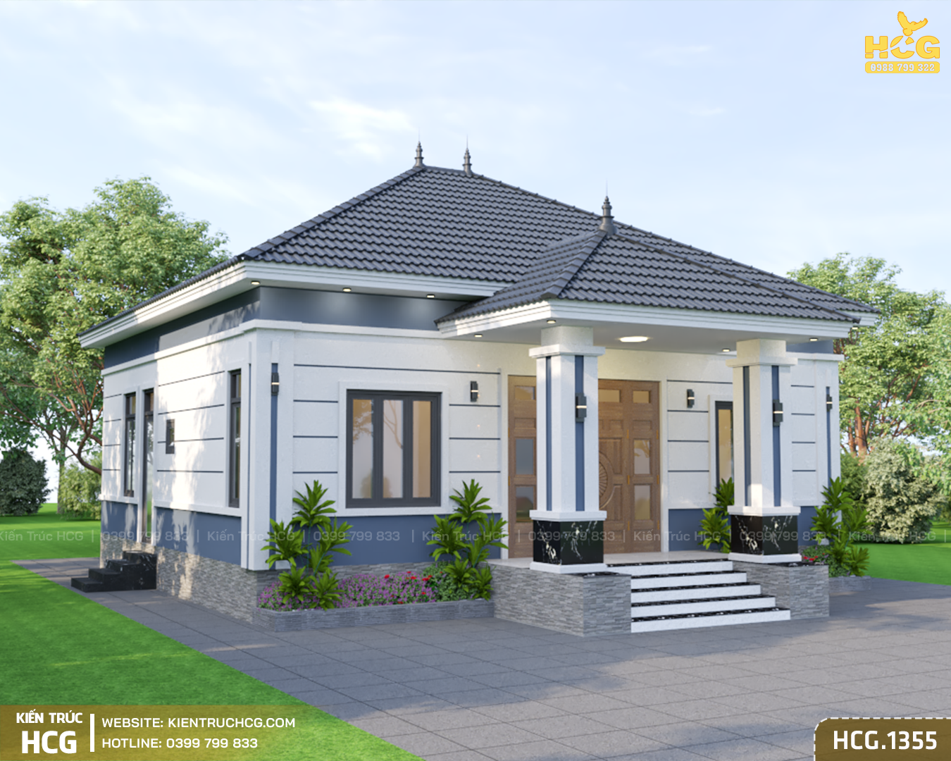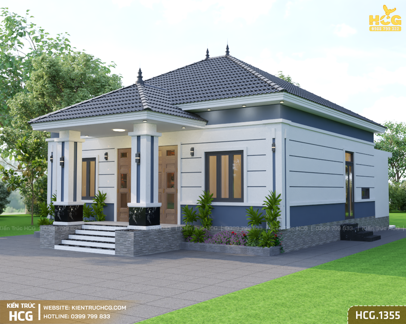Mẫu nhà vườn 1 tầng HCG.1355 hướng tới sự cân đối và thực tế trong sử dụng. Không quá cầu kỳ về hình thức, công trình tập trung vào bố cục rõ ràng, dễ ở và phù hợp với nhu cầu sinh hoạt lâu dài. Với phong cách mái Nhật, ngôi nhà mang lại cảm giác thanh thoát, nhẹ nhàng nhưng vẫn giữ được sự chắc chắn và bền vững.